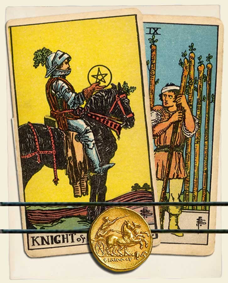 Knight of pentacles and Nine of wands combination indicates that tarot influences: 1) Hard Work and 2) Last Stand govern your life decisions today. In essence you will overcome. Lately, the assaults on your character have been coming relentlessly. You’ve done well to defend yourself, too. Still, even you are finding it difficult to keep up. Well, fear not. These cards imply that next wave will be the last. When it subsides, your stoicism will be handsomely rewarded.