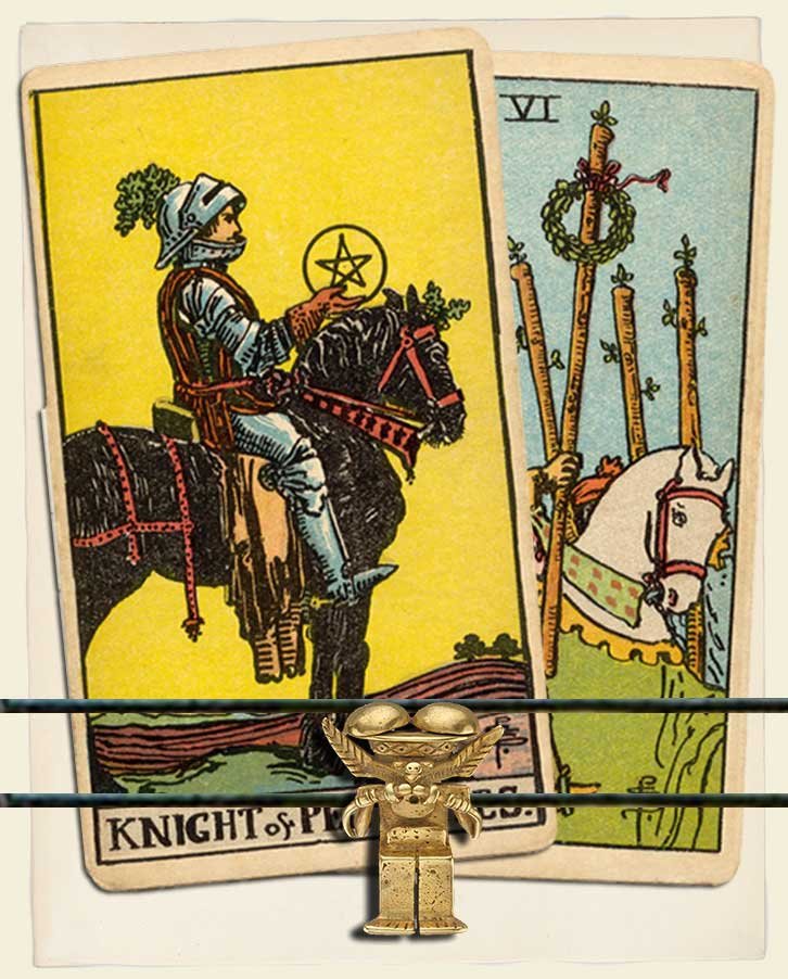 Knight of pentacles and Six of wands combination means that two tarot influences: 1) Conservative and 2) Rewards are steering you into another direction today. Your efficiency at work will be rewarded and all of your hard work will pay off. Taking small steps into the right direction, even when you are afraid of daring too much, will lead you to small little victories. Be brave and take risks. You don’t have to have it all figured out to move forward. Don‘t stick too much to limitative backgrounds, escape them and free your spirit to endless possibilities.