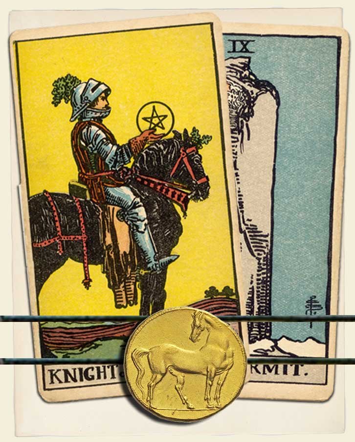 Knight of pentacles and The Hermit tarot combination indicates that arcane tarot forces: (1) Conservative and (2) Search For Self govern your life decisions today. To put it differently, it means you know that you can be a little stuffy, but you are also fighting the urge to figure out who you really are, underneath all the rules you’ve had drawn over you over the years. What if a carefree soul was dying to get out, but didn’t know how? Try and find yourself, under the layers of pretense.