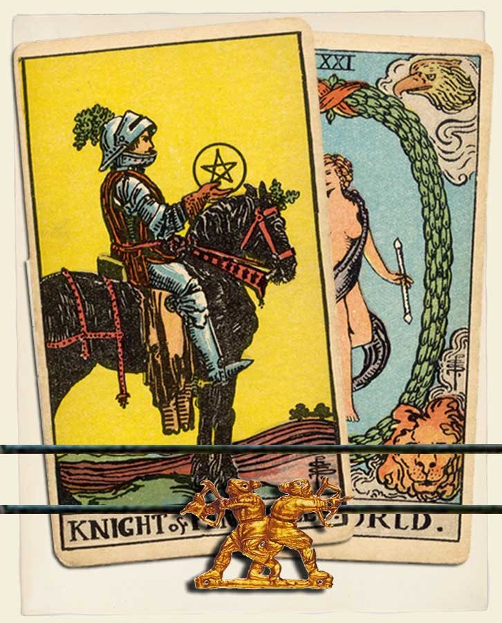 Knight of pentacles and The World combo gives a glimpse into a significant event in your future, which will come about from the influences of (1) COMMITTED (effect of Knight of pentacles) and (2) SENSE OF BELONGING (effect of The World). How to interpret this tarot combination in practice? You are moving forward with an important project that requires you to set aside some time for hard work. This is not easy for you. It’s been difficult before, but now it seems like there is more at stake than just your own sense of self-importance. There is something larger at play here, as indicated by the presence of the World card. Whatever you are doing has global implications that may be affecting other people’s lives too. Take care not to get lost in your own ego or take on too much responsibility for things beyond yourself.