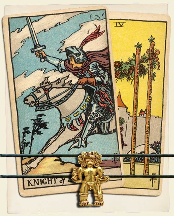 Knight of swords clarified by Four of wands means that two tarot influences: A) Daring (Knight of swords) and B) Homecoming (Four of wands) guide your decisions today. What’s the meaning of this pair? The Knight of swords is the fastest moving knight in the Tarot. He rides in quickly and speaks the truth bluntly, sometimes leaving disarray in his path. A message you may not want to hear may be on the way to you, or perhaps you’re the one who has to tell it. Whatever the case, it will likely affect whatever represents home to you, as indicated by the Four of wands. This card may also be about someone returning home, so perhaps, you or someone close to you is making this journey. There will be difficult, perhaps even harsh conversations. They will be truthful, though, so hold on to that and turn away from recrimination.
