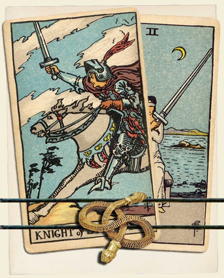 Knight of swords and Two of swords combo is a sign that arcane tarot forces: 1) Ambitious and 2) Difficult Decisions govern your life decisions today. How to interpret this in practice? In essence, these cards are asking you to remain resolute. Lately, your challenges have seemed as insurmountable as a sheer cliff face. No matter what you try, you end up sliding back down. Well, these cards are imploring you, don’t give up. After all, the fool who persists in his folly will become wise, as the poet says. So keep going: soon enough, you will find a foothold
