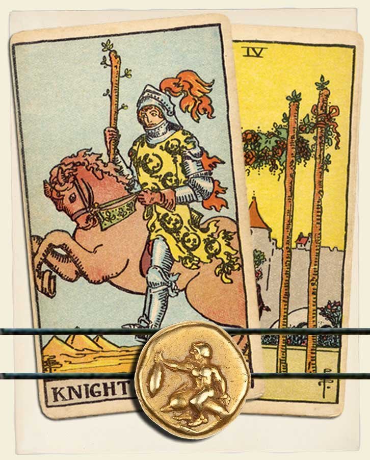 Well, well, well. The Knight of Wands and Four of Wands combination is a rather auspicious sign for love and relationships, my dear. It seems that the tarot forces are aligning in your favor with influences of courage and celebration.