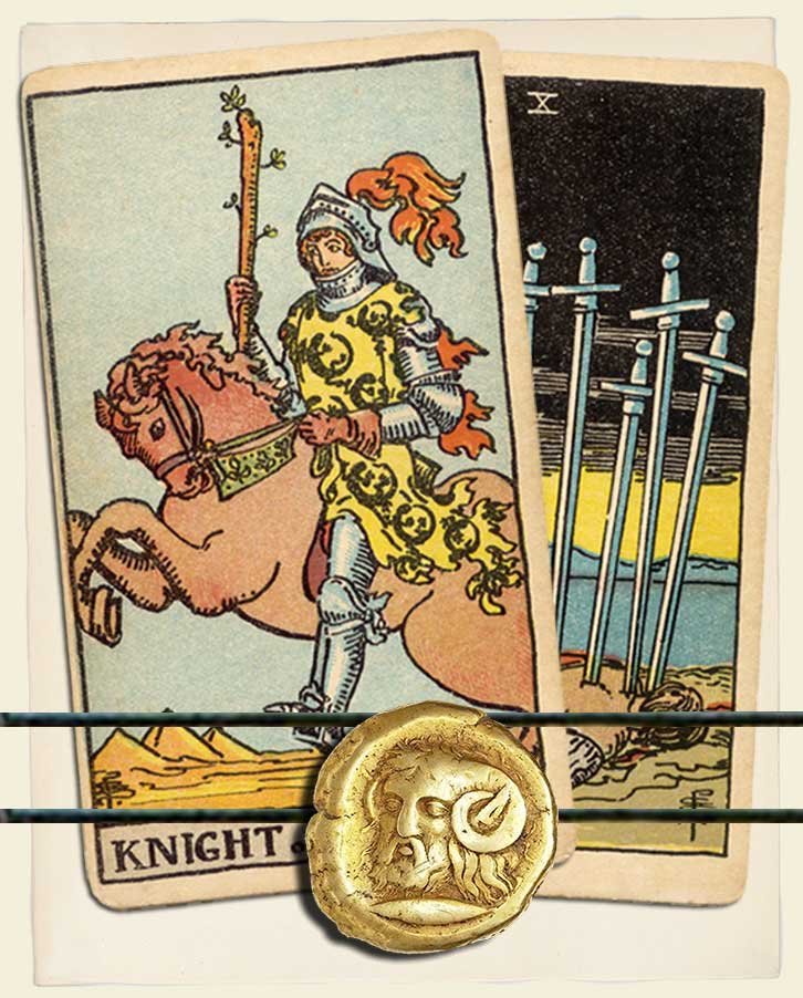 Knight of wands and Ten of swords tarot combination gives an insight into a major event in your future, which is influenced by the tarot forces of (I) Impulsiveness and (II) Betrayal. How to interpret this in practice? The Knight of Wands can be a charming, adventurous person who often has good ideas about how to approach life. He may also have a tendency to rush things sometimes though, so when you find him with the Ten of Swords – or any other card that represents betrayal – it is wise to take pause before jumping at every opportunity. There are some great ideas out there waiting for you if you just stop and think about it for a moment or two.