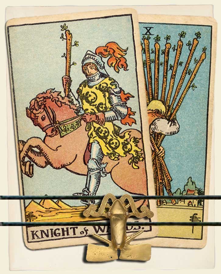 Knight of wands and Ten of wands tarot combination indicates that two forces: I) IMPULSIVENESS (Knight of wands) and II) EXTRA RESPONSIBILITY (Ten of wands) together are exerting influence on you. The weight of an imbalance in work and personal life has reached an all-time high, and you are unsure how much more you can take. Jump off the cliff of comfort and take a risk that will bring newfound energy to your life. A getaway vacation, a road trip, or merely a change of scenery will speak to your inner sense of adventure, and in turn give you clarity when you return to your current world of how to manage your affairs.