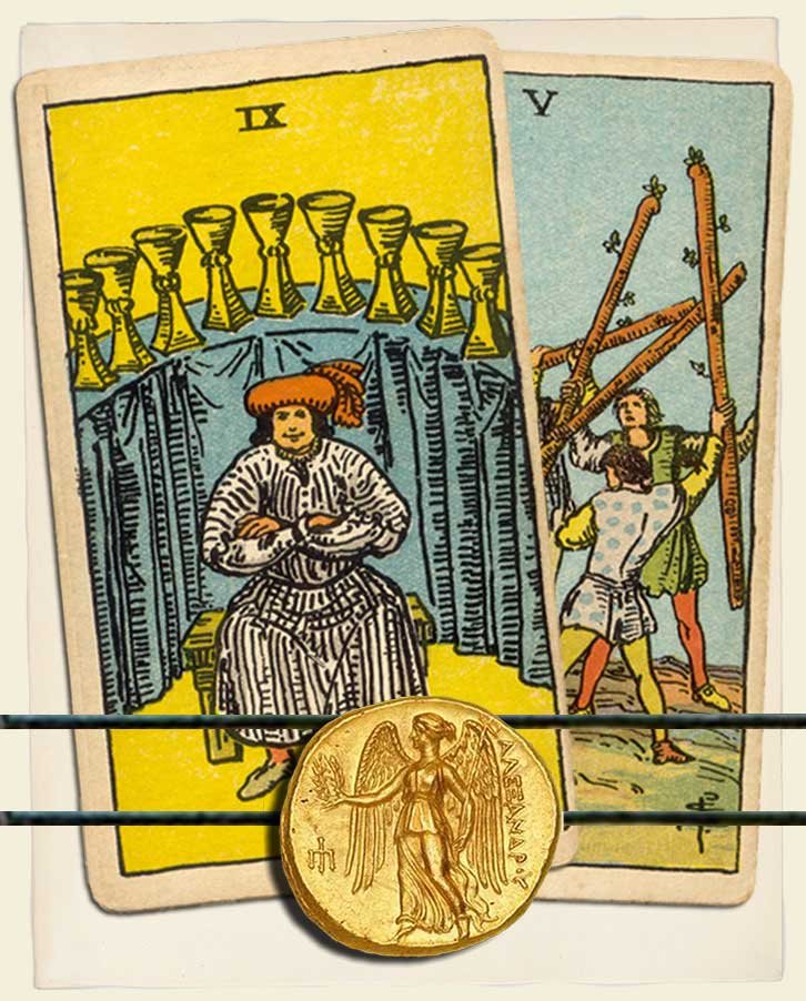 Nine of cups and Five of wands combination gives an insight into your near future, which is influenced by the arcane forces of (A) SATISFACTION and (B) COMPETITION. Only a few more steps to go and you will accomplish all that you have been working towards with a sense of accomplishment and pride. Allow yourself to bask in this time rather than jumping into the next task. It is crucial that we celebrate our successes and admit when we have done something well. There is nothing selfish about taking pride in yourself if it is done with humility.