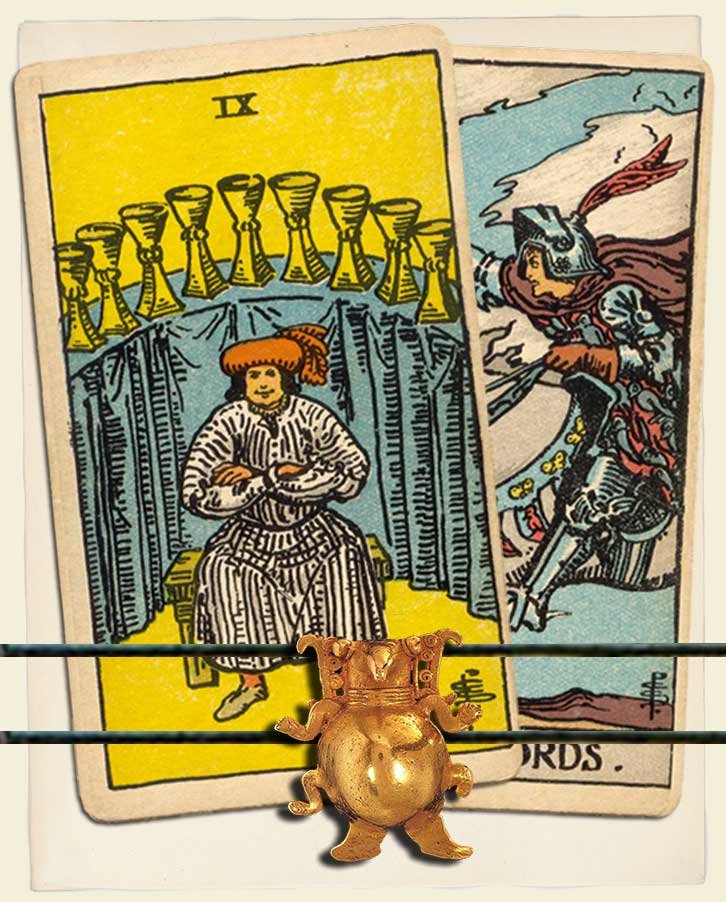 Nine of cups and Knight of swords tarot combination gives a hint that mystic tarot forces: (1) Wish Come True and (2) Intellectual currently guide your decisions. This reading implies that a suspicion of yours will soon be confirmed: you make your own luck in this world. Well, you’ve certainly been busy in that department! You’ve spent years increasing your knowledge and, to a certain extent, your wisdom. And it looks like you’ve chosen well. Soon, your ‘luck’ will change for the better. Just try and act surprised when it does.