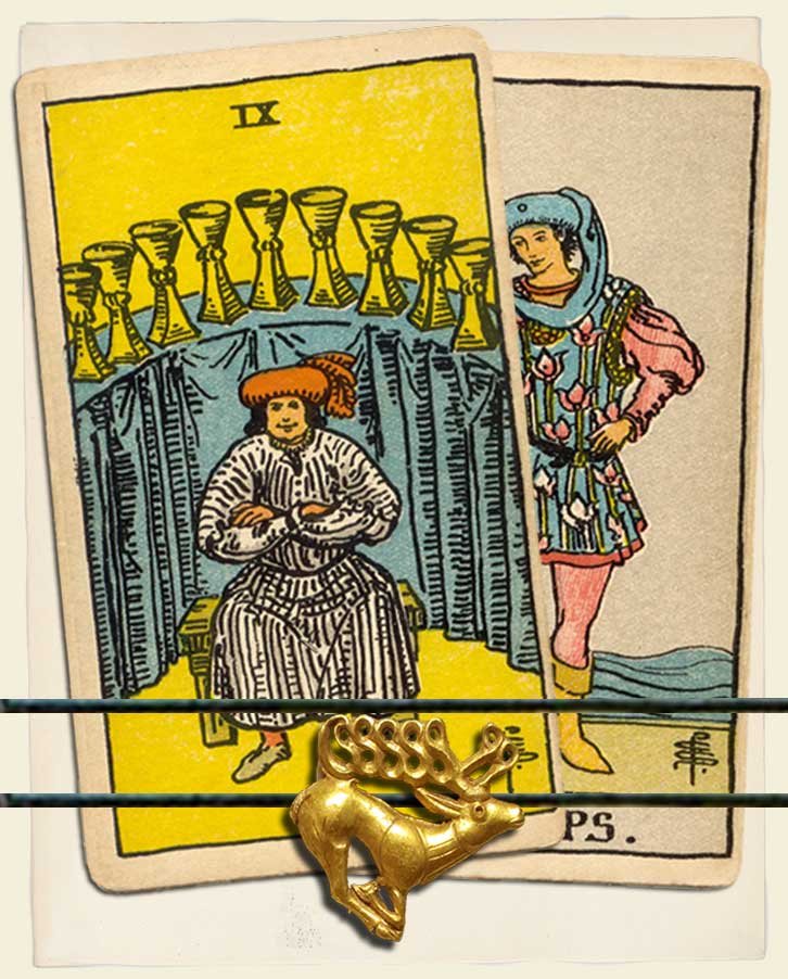 Nine of cups and Page of cups combination gives a hint about your distant and barely discernible future, which will come to pass from the combined effect of (1) WISHES COMING TRUE (effect of Nine of cups) and (2) POSSIBILITY (effect of Page of cups). In a nutshell, you must open yourself to new opportunities and expand your horizons in order to make your dreams come true. If there is something that you desire greatly, make sure to embrace the new opportunities that show up your way, as they can open many doors and lead you to successes. If you want your wishes to come true, make sure to be persistent and believe everything is possible.