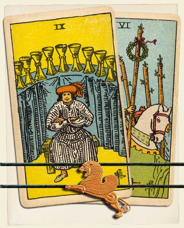 Nine of cups and Six of wands combination means that tarot influences: 1) WISHES COMING TRUE (influence of Nine of cups) and 2) SUCCESS (influence of Six of wands) are jointly affecting you today. What’s the advice of this pair? The Nine of cups is a card of victory that represents seeing your wishes come to fruition. The Six of wands also represents triumph, often after a long battle. This combination of cards indicates that you have set clear intentions and worked towards your goals. After many ups and downs, you are finally reaping the rewards and receiving the recognition you deserve for your hard work.
