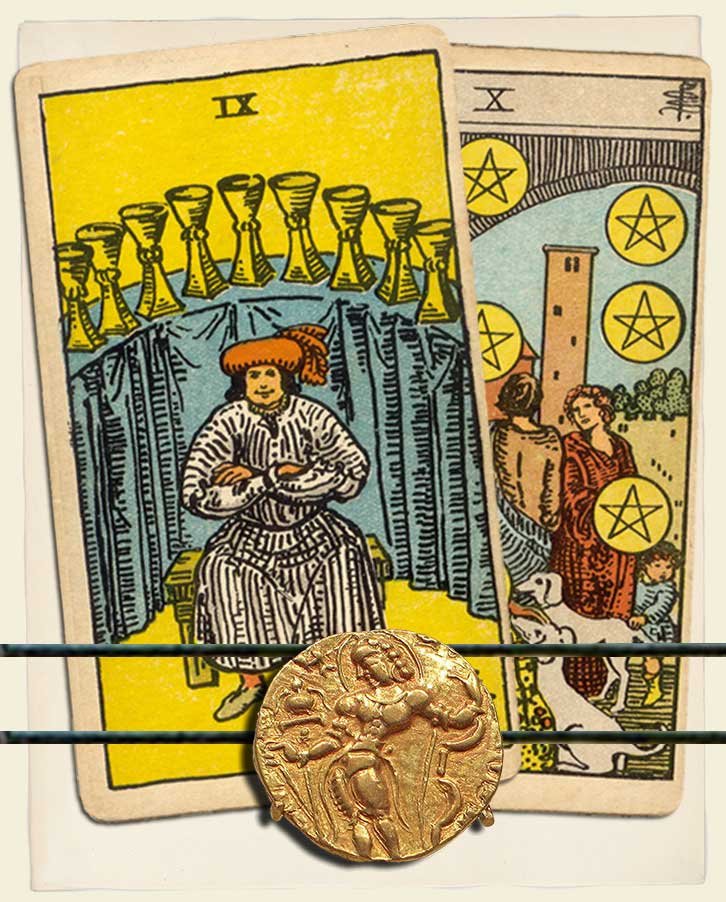 Nine of cups and Ten of pentacles combination provides an insight into a major event in your future. It will come to pass from the combined effect of (1) CONTENTMENT (effect of Nine of cups) and (2) WEALTH (effect of Ten of pentacles). In other words, it means you’ve been looking for value in the wrong places. Still, that’s not to say you haven’t enjoyed success of a kind. Look around: the trappings of material wealth are all around you. But, if you’re honest, you’re still just as unhappy. Well, these cards suggest it might be time for a change. Look inward, seek fulfilment on the spiritual plane. Only that will last, after all.