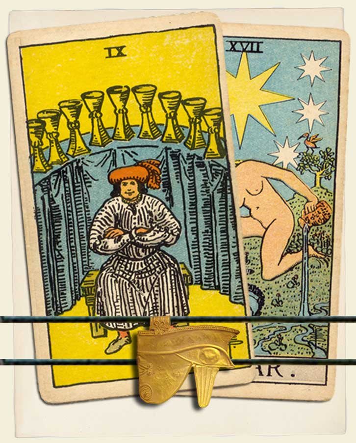 Nine of cups and The Star combination means that arcane tarot forces: 1) Wish Come True and 2) Renewal are affecting you in this card reading. To put it differently, it indicates that hope really can be the path to your most beloved dreams. When you see this combination, find the time to stop and wish upon a star. Whatever you want is waiting. Are you looking for love, or is it money, or a perhaps a perfect hair day? Still, maybe you are hoping for that job that gives you most weekends off. Just ask for it and follow the light of that distant North Star that falls into a rainbow shower of Skittles and Starbucks. This is your day. Don‘t waste a moment of this good omen.
