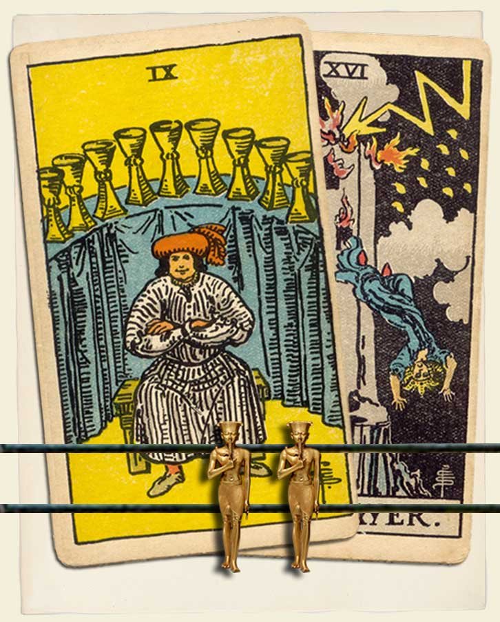 My dear child, the combination of Nine of cups and The Tower in love and relationships is a complex one. It suggests that you will have a clearer perception about a major event in your future. While the effect of Nine of cups brings fulfillment and contentment, the effect of The Tower brings trauma. It may seem like an unfavorable sign at first glance, but there is hope to be found.