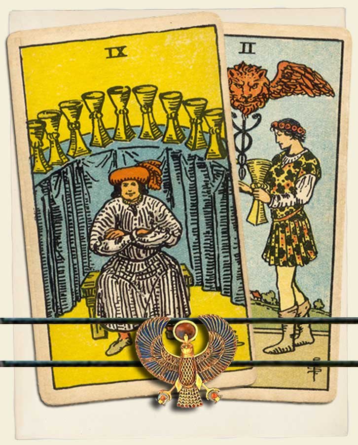 Nine of cups and Two of cups combo means that two forces: 1) Achievements and 2) Partnership are jointly affecting you today. To put it differently, it indicates You’re wrong in thinking that you need someone in your life in order to be happy. You do not always have to have a partner to feel like you have achieved all that you want in your life. You need to appreciate your time alone more often and be more present when you are alone. This means that you shouldn’t be afraid to ditch the headphones from time to time or “forget” your phone at home on purpose someday. You could benefit from taking some time off from your partnership and feel the success of your achievements all by yourself while you take yourself on a fancy date.