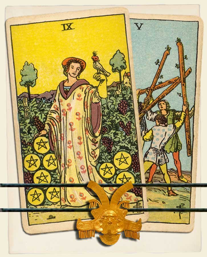Nine of pentacles and Five of wands combination indicates that two forces: 1) Success and 2) Conflict are influencing you at this moment. You have been too concerned with attempting to ‘win’ arguments. Although feeling as if you have the upper hand may result in temporary self-satisfaction, this triumph simultaneously tarnishes your relationships and connections with others. It is time to realign your priorities and work towards a new, productive goal. The next time a conflict arises, reframe your perception of a successful outcome, aim to resolve the disagreement, even if that means shrinking your ego.