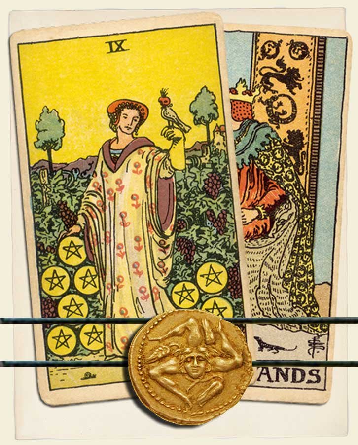 Hey, Combotarot Nation! Today we’re going to talk about the Nine of Pentacles and King of Wands combination in relation to love and relationships. This pairing is considered a great sign for your future, as it hints at a major event influenced by success and boldness.
