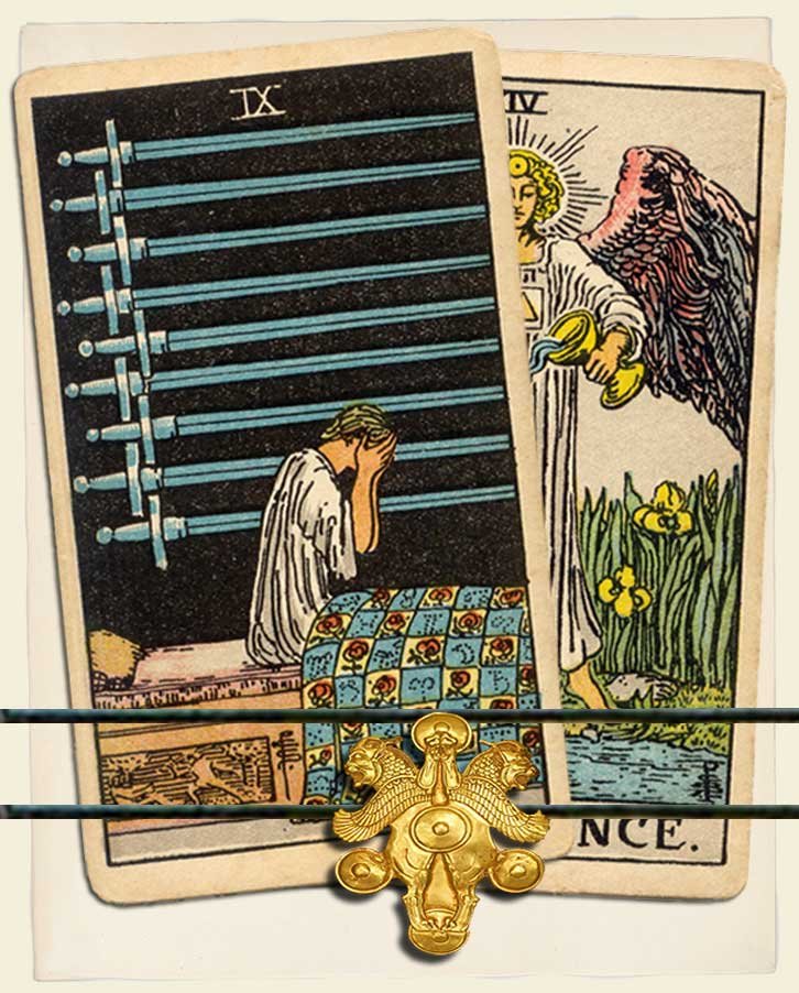 Nine of swords and Temperance tarot combination gives a clearer perception about your near future. It is directed by the guiding influences of (A) Anxiety and (B) Balance. To put it differently it means you are probably spending a lot of time on the middle path at the moment. Whilst Temperance teaches us the virtue of patience, the energy of Nine of Swords speaks of hopelessness and trauma. What this combination is asking us to do is to search for meaning with Temperance – this way, any anxiety we have on any situations can be brought to a balance in our mind and we can make decisions from a more stable point of view.