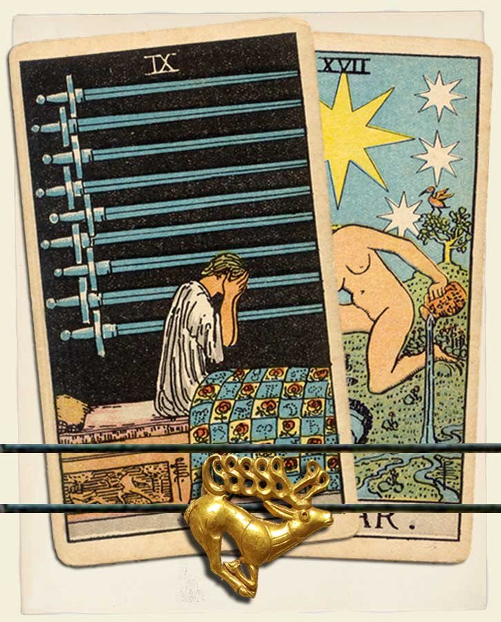 Nine of swords and The Star tarot combination means that two arcane effects: 1) Depression and 2) Renewal together are exerting influence on you. What’s the advice of this pair? You may be feeling down in the dumps, but don’t stay there. This is a card of moving forward after difficult times. It indicates that you need to get out of your head and take action to improve your situation. The Nine of Swords can indicate mental exhaustion or even depression, so it is important to listen carefully for an underlying reason why you feel this way before taking any rash actions like ending a bad relationship or quitting your job. If necessary, seek professional help.
