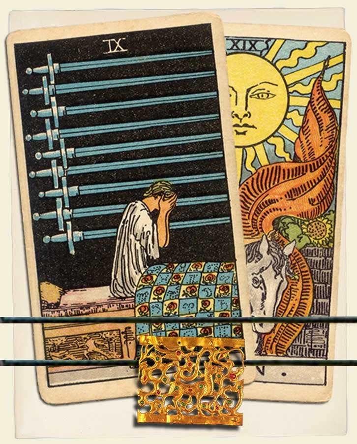 Nine of swords and The Sun together gives a hint about your near future. It is directed by the guiding influences of (A) Depression and (B) Success (as per influence of The Sun). When you let go of your sadness, magical things can occur. It may not be as easy as just flipping a switch, and the heavy weight of helplessness that has encapsulated you all this time won’t simply disappear, but you can slowly turn your mood around and connect with the world again. It may seem scary, but you can do it.