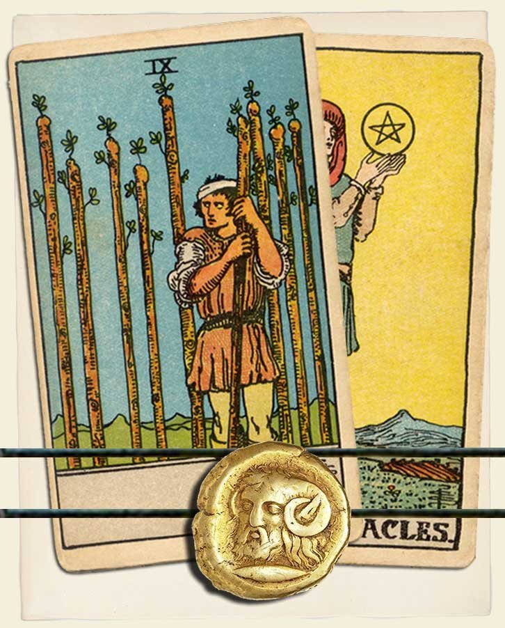 Nine of wands and Page of pentacles combo gives you a hint about your near future. It will come to pass from the combined effect of (1) PERSISTENCE (effect of Nine of wands) and (2) AMBITIOUS (effect of Page of pentacles). It seems as if door after door is being slammed in your face. Of course you are feeling disheartened, when the hard work you tirelessly put in appears to reap no tangible rewards. This combination reassures you that soon your efforts will be recognized, and your dreams will become reality. When one door closes, another one opens. Persistence will be your key to success, so keep chipping away at the goal you have been striving for.
