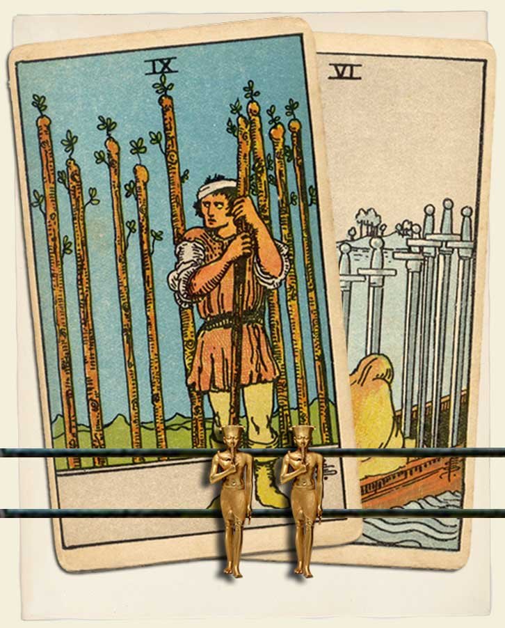 Nine of wands and Six of swords combination provides an insight into your medium-term future. It is influenced by the tarot forces of (I) resilience (from Nine of wands) and (II) escape. What’s the advice of this pair? You may be going through a rough time, but you have it in you to get out of it. The Nine of wands indicates that something very difficult has happened to disrupt your equilibrium. This card represents being at the edge of disaster – almost falling over the cliff into oblivion. Under this energy, people often feel as if they are on their last legs. The Six of swords represents restful sleep after a trying ordeal, so perhaps you can use that time to regroup and prepare for another battle soon enough.