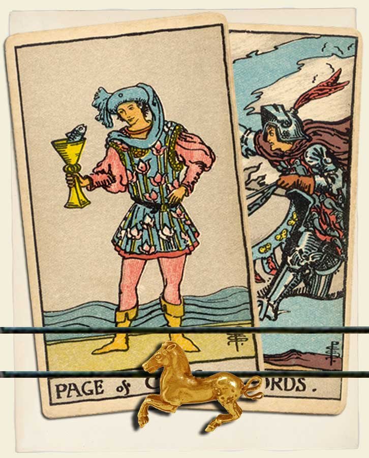 Page of cups and Knight of swords tarot combination means that tarot influences: 1) Creative Opportunities (from the side of the Page of cups) and 2) Direct (from the side of Knight of swords) is jointly affecting you today. The appearance of two court cards should also lend some greater meaning to the pairing. Court cards can be read in a variety of ways, but often reference actual people. When two court cards do not share the same “rank” as these two cards do, the cards may indicate two people of different ages or skill levels in some way. Depending on the rest of the tarot spread, this relationship may be positive and beneficial (sometimes romantic), or negative and combative. This may include receiving some good news from distant relatives, old friends calling up and checking in on you, or receiving job offers that suit your interests.