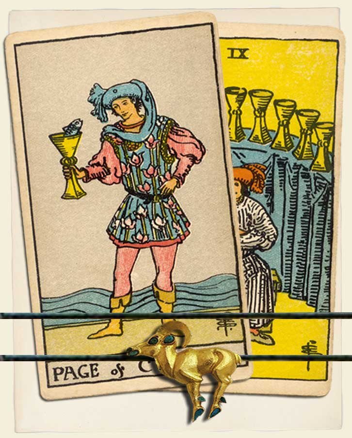 Well, hello there! Let’s talk about the Page of cups and Nine of cups combination for love and relationships. This is a fine sign, my dear. The forces of possibility and wishes coming true are at play here, suggesting that happiness can be found in simple things while surrounded by people who truly care about you.