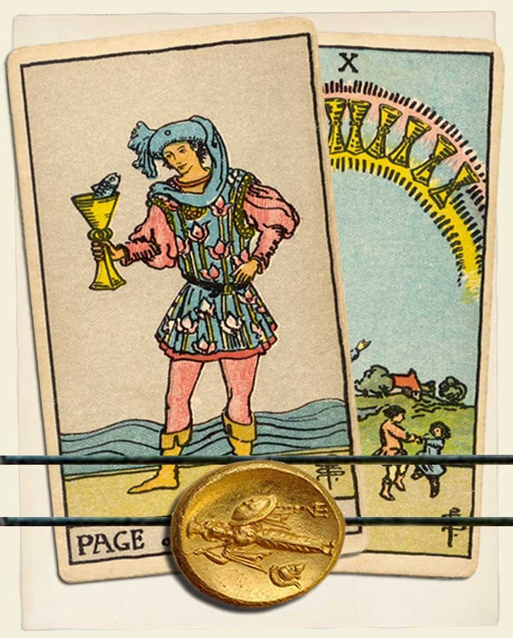 Oh my goodness, if you draw the Page of Cups and Ten of Cups together in a love reading, it’s like winning the jackpot! This is such an amazing sign for your relationships. The combination of these two tarot influences means that today intuitive messages and happiness are at play in your life. You might start noticing signs from the universe – little hints and nudges that guide you towards something or someone special.