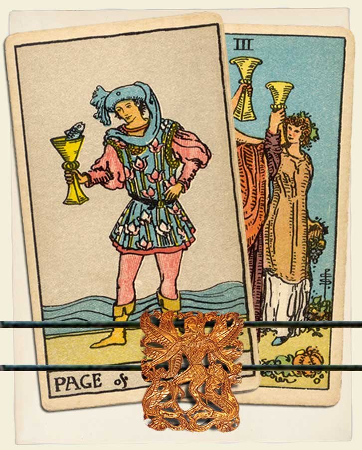 Page of cups and Three of cups tarot combination means that two mystic forces: 1) Curiosity (Page of cups) and 2) Friendship (Three of cups) are influencing you at the moment. What’s the advice of this pair? The Page card represents an adventurous, curious energy that often carries a sense of innocence. This curiosity can lead to embarrassment or even danger. The Three of cups indicates that there is someone in your life who cares about you deeply and wants to help you learn from your mistakes. Be sure not to burn any bridges along the way, though. The Page card sometimes visits alone, but it also comes with its page – a young person who may be new to an environment they need to navigate carefully. If you have children or other close associates, take care not to let them get hurt by your enthusiasm for exploring new things.