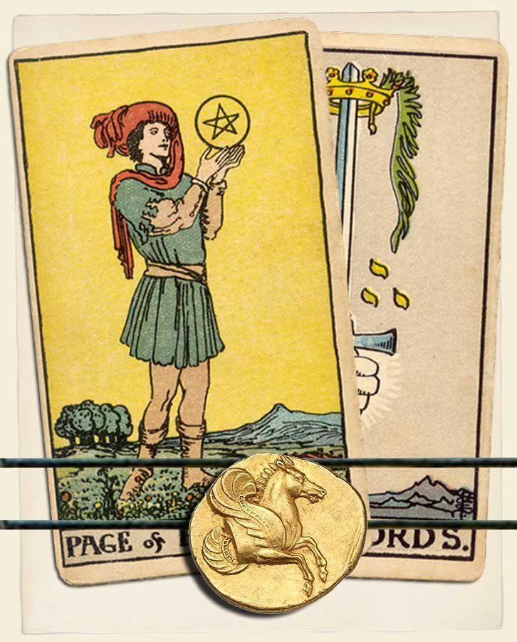 Page of pentacles and Ace of swords tarot combination gives a hint about your distant and barely discernible future, which is directed by the guiding influences of (A) SKILL DEVELOPMENT and (B) MENTAL CLARITY (as per influence of Ace of swords). The Page of pentacles can be an excellent student. He or she has a lot to learn, but with the ace here, it will be easier for you to concentrate on those lessons. You are in control now. Your mind is clear enough that you know what you need to do next. So, go ahead and take that step forward into new territory where you may find some fertile ground for your skills.