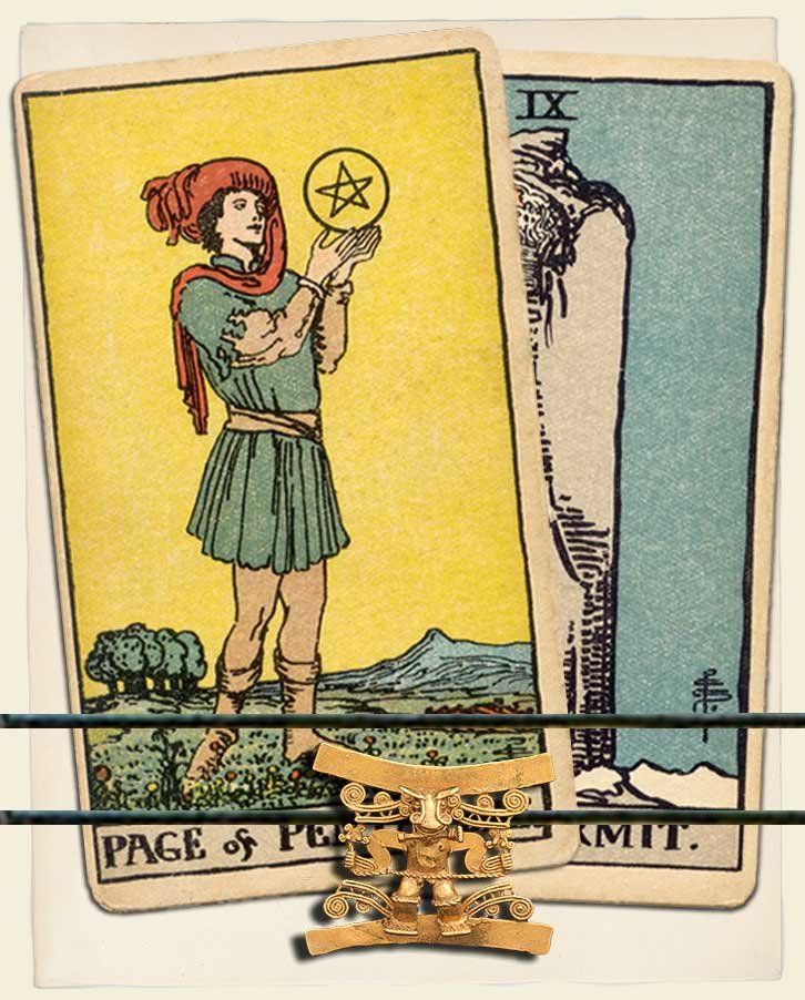 Page of pentacles and The Hermit combination means that arcane tarot forces: 1) Financial Opportunity and 2) Self-Reflection are altering your life path at this reading. In other words, it means that you could be in the midst of a time of reflection regarding your career or ambitions. The Hermit suggests that we are doing some inner work – alongside the Page of Wands, which reflects financial opportunity, you will be spending some time contemplating your ambitions, that which can earn you monetary gain. With the Hermit, this is asking us to use our inner guidance on our quest. Let your intuition guide you when choosing a vocation – this ensures not just financial gain, but happiness and peace of mind also.