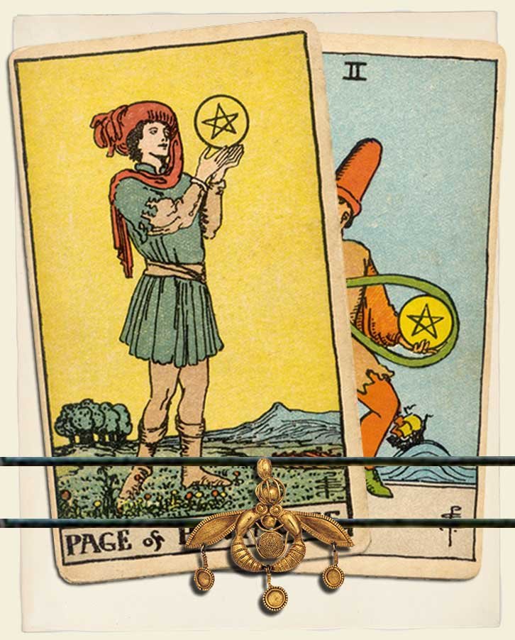 Well, my darling, the Page of Pentacles and Two of Pentacles combination for love and relationships is quite an intriguing one. It appears that there are two forces at play here – skill development from the side of the Page of Pentacles, and multiple priorities from the side of the Two of Pentacles.