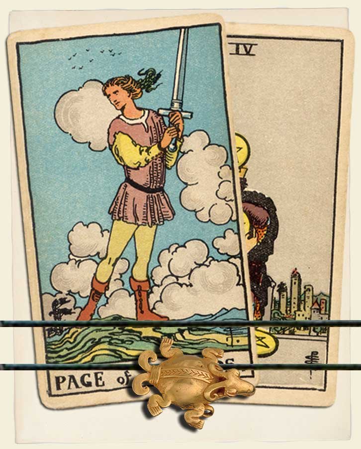 Page of swords and Four of pentacles tarot combination gives you a peek at your near future, which is influenced by the arcane forces of (A) CURIOSITY and (B) SCARCITY. When the going gets tough, you have to options. The first would be to give up, go home and forget about all of it. The second would be to allow a little curiosity in, and let it breed into action. Which do you prefer, and which will take you places you’ve never been?