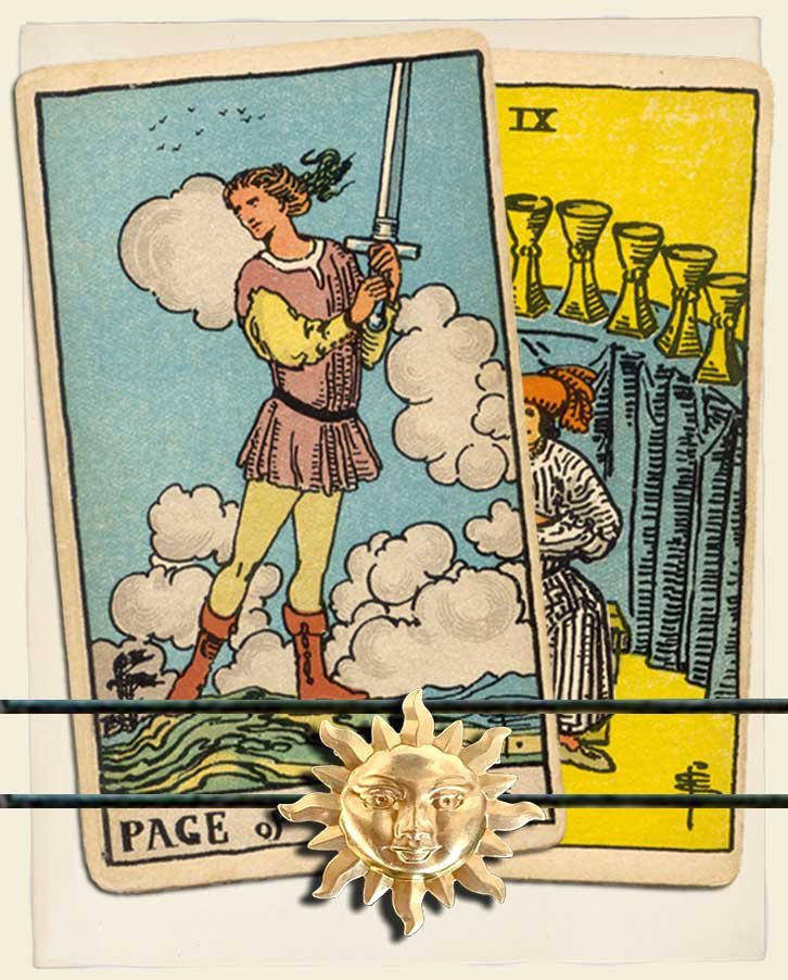 Page of swords and Nine of cups tarot combination gives you a peek at a major event in your future, which is directed by the guiding influences of (1) THIRST FOR KNOWLEDGE and (2) ACHIEVEMENTS (as clarified by Nine of cups). In other words, it means that the solution to a longstanding problem will soon come to light. You have been stuck in the belief that you are unable to move on from this issue. Seeking advice from those around you will not only provide comfort and strength, but also knowledge and an insight into how to leave the problem behind. You will feel a profound sense of achievement and relief once the heavy burden is lifted from your shoulders.