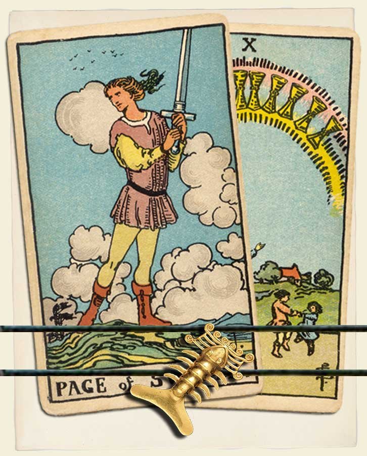 Page of swords and Ten of cups combo gives a hint about your near future, which is influenced by the arcane forces of Chatty and Divine Love. The sweet, sweet words of the Page of Swords, or was that the Page of Cups, no I‘m sure we were talking about the Page of Swords, and this one is all about love—true love, but anyway about that Page of Swords… he can be a very brilliant sweetheart, but he can also be trouble sometimes too. Then, there is the confusion and the rumors and the half-truths, and all that other stuff that can come from the suit of swords, but don‘t worry. With the Ten of Cups involved, true love will win in the end—this time.
