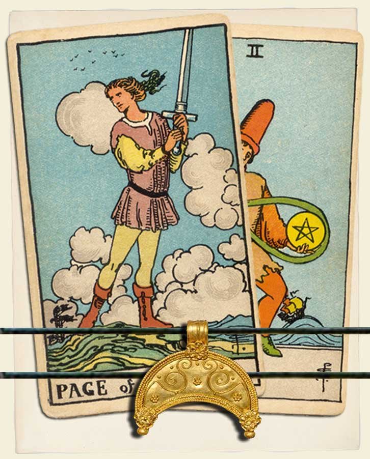 Page of swords and Two of pentacles together indicates that arcane tarot forces: 1) Thirst For Knowledge and 2) Prioritization govern your life decisions today. How to interpret this tarot combination in practice? Most tarot readers would consider this a good omen, and it is. The new area of interest you have been wondering about is a good path for you to take. You should rearrange your schedule to accommodate the instruction this new area will require. This will not be an easy path, but your fate has brought you to it and this is the time for you to embrace it.