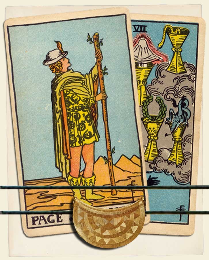 Darling, it seems you’re in a bit of an uncertain situation when it comes to matters of the heart. The Page of wands and Seven of cups combination is not exactly what we would call a clear-cut sign for love and relationships. You see, this pair provides insight into your near future with influences from both ideas and illusion.