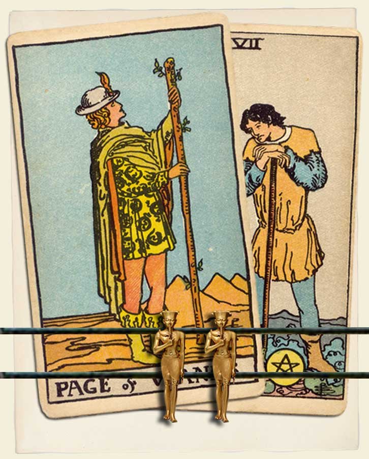 Page of wands and Seven of pentacles combination means that two mystic forces: (1) Ideas and (2) Perseverance (influence of Seven of pentacles) are altering your life path today. You have new ideas about your life. You are about to decide what direction you want to take. You have an important exam coming up and if you keep up the pace, you’ll benefit. You are determined and steady but your excitement is causing you to panic. Take a deep breath and everything will go well.