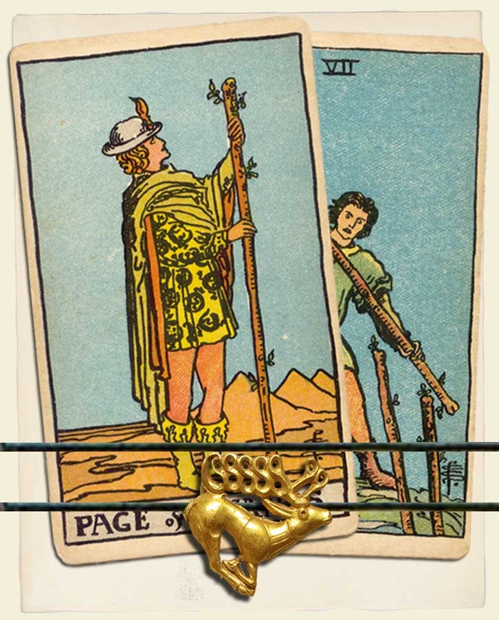 Page of Wands and Seven of Wands combo interpretation