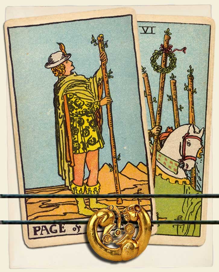 Page of wands and Six of wands combination gives a hint about your immediate future, which is directed by the guiding influences of (A) FRESH IDEAS and (B) TRIUMPH. To put it differently, it indicates that you have been given the green light to pursue a dream that drives you. The muses speak to you through inspired thoughts at this time, and you’d be wise to listen to them. You have an original vision, and the timing is right. Keep in mind that Fortune favors the bold, and take action on this idea before the moment passes you by.
