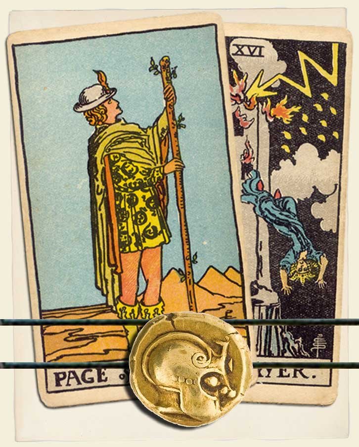 Greetings, young one. I see that you seek guidance on matters of the heart. The Page of Wands and The Tower combination is a powerful one indeed, as it speaks to two mystic forces at play: excitement and sudden change.