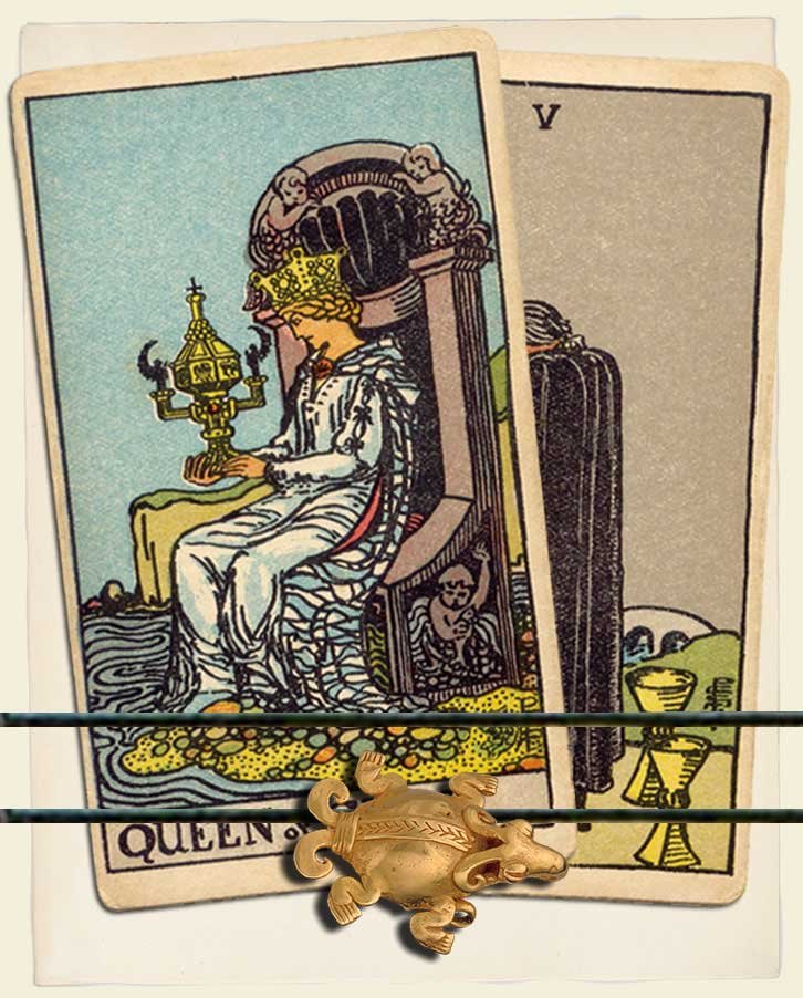 Queen of cups and Five of cups combination is an omen that arcane tarot forces: 1) Warmth (Queen of cups) and 2) Regret (Five of cups) have influence on you at this moment. How to interpret this tarot combination in practice? The Queen of Cups represents a warm, loving energy that can heal any wounds. It also carries the message that there may be something wrong with your judgment or even some secrets keeping you from moving forward. The Five of Cups indicates that these cards are urging you to look back regretfully on past decisions. This period in your life has been marked by sadness, but it is now time to move forward as the Queen of Cups promises warmth and happiness for all your hard work.