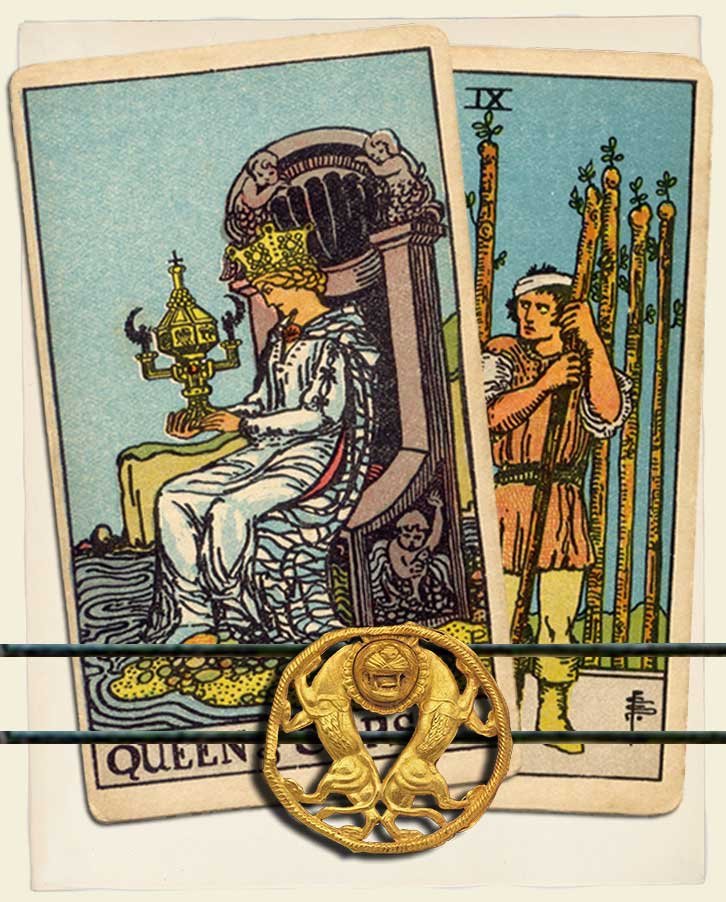 Queen of cups and Nine of wands combination gives you a peek at your near future, which will arise from the combined effect of: (I) WARMTH (effect of Queen of cups) and (II) COURAGE (effect of Nine of wands). What’s the advice of this pair? The Queen is an emotionally mature energy that can help balance out any rash or impulsive behavior. You may be feeling down about something in your life, but with the Nine here as well, it might be time to take a step back and think before acting. This card indicates that there is some fear present that needs to be addressed. It also urges you not to bottle up these feelings inside. They won’t go away on their own, so they need to find expression in more stable ways. The Nine also represents having one’s territory defended vigorously by loyal troops who are willing to lay down their lives for their cause. If you have strong convictions about what needs to change in your life, now is the time for bravery and self-sacrifice.
