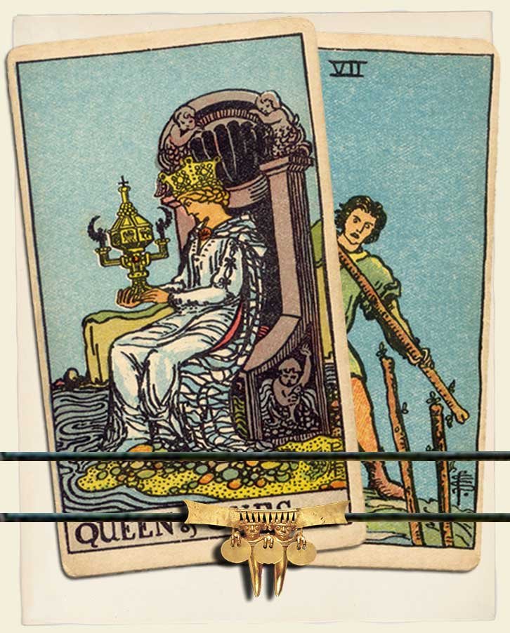 Greetings, my dear ones. Today we shall speak of the Queen of Cups and Seven of Wands combination in matters of love and relationships. This is an unsure sign, for it brings forth two mystic forces: caring and protectiveness.