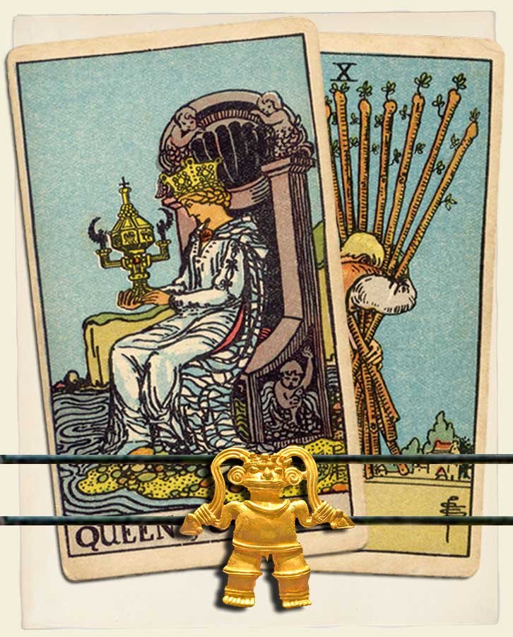 Well, my dear, it seems we have quite the enigmatic combination on our hands here. The Queen of Cups and Ten of Wands for love and relationships is neither good nor bad, but rather a clearer perception of what’s to come. It’s influenced by the arcane forces of Supportive and Responsibility, which can only mean one thing – you’ll soon be called upon to lend your aid to someone you hold dear.