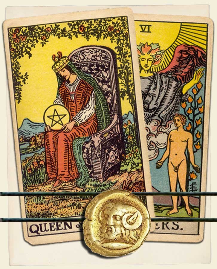 Queen of pentacles and The Lovers combination is a sign that arcane tarot forces: I) Nurturing (Queen of pentacles) and II) Values Alignment (The Lovers) are affecting you in this card reading. What does it mean in practice? It means that your relationship with someone is maturing, as indicated by the presence of the Queen of pentacles. This nurturing energy can be very stabilizing, so don’t take advantage of it to become too comfortable. The Lovers card indicates that there is an important lesson for you to learn about relationships. You may have been avoiding something or someone but now you need to face up to what needs changing before things get worse. Don’t avoid confrontation, embrace change.
