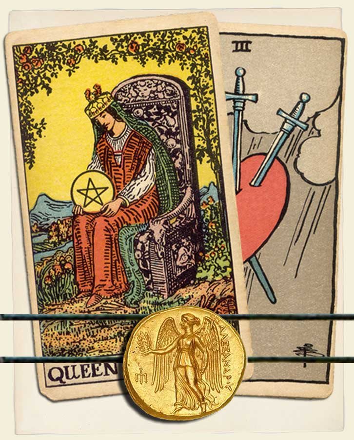 Queen of pentacles and Three of swords combo is an omen that mystic tarot forces: 1) Providing Financially and 2) Sadness are steering you into another direction today. The queen of pentacles in the Tarot represents a natural provider. You are caring, you provide for yourself and your family, and good financial opportunities are coming your way. The three of swords, on the other hand, shows a true heartbreak. This pair could be interpreted in two different ways: 1) You will finally find the strength in yourself to reconnect with the material world after a heartbreak. You will flourish financially. 2) Your maternal characteristics are what people are drawn to. You give an all-loving, welcoming energy with a genuine and open heart. Someone feels vulnerable and broken without you.