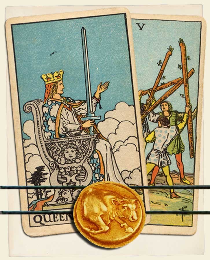 Queen of swords and Five of wands combination indicates that two forces: 1) Honest (influence of Queen of swords) and 2) Aggression (influence of Five of wands) are exerting their influence on your life’s choices. What does it mean? The struggle to attain money, power, or success is coming to an end. You are about to reap the rewards from the seeds you planted earlier this year. Be careful to keep your temper about you. Because of this, you should find a creative outlet to avoid bubbling over.