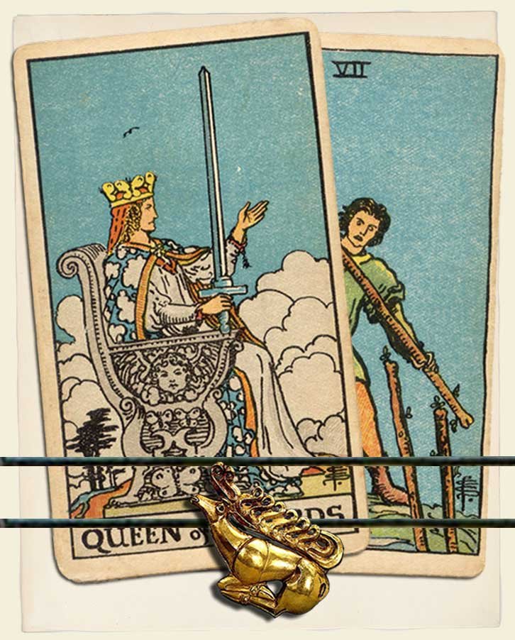 The Queen of swords and Seven of wands combination provides a glimpse into your prevailing state and close future in love and relationships. It is directed by the guiding influences of independence and stamina, indicating that you have been working hard on something, but now it is time to take a break. The Queen of Swords can be an intimidating energy, so you may need to defend yourself before you can rest for a bit. However, with the Seven of Wands present, stamina will be required in order to reach your destination safely.
