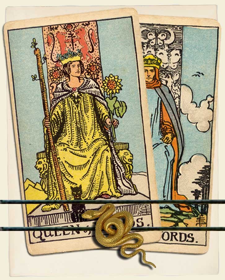 Queen of wands and King of swords tarot combination gives a clearer perception of your medium-term future, which is influenced by the tarot forces of (I) Social Butterfly (from Queen of wands) and (II) Intellectual Power. With these energies in mind, you are being reminded to blend your need to socialize with objectivity and logic. In a work environment, for example, the consideration of others’ well-being can carry the same merit as the use of intellect. Even through more practical tasks and concerns, sometimes it’s necessary to consider the surrounding emotional landscape. On the flip side, perhaps it’s a good time to compartmentalize your emotional responses to keep the ball rolling in your work or lifestyle. Whether you need to integrate your intellect or your emotions in the given situation, you are being called to foster a balance between logic and emotion now.