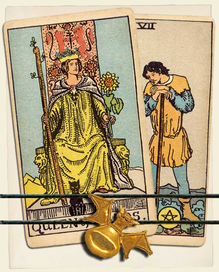Queen of wands and Seven of pentacles combination indicates that two mystic forces: 1) Courage and 2) Rewards are effecting your person at this moment. What’s the advice of this pair? The Queen of wands is a passionate, determined energy that often carries an air of danger. It can be reckless to let it run wild, but sometimes it is necessary to take risks in order to move forward. This card urges you not to act recklessly or with no thought for consequences. Instead, use your courage and think about what you want out of life before taking any action on behalf. The Seven of pentacles represents abundance after careful planning and hard work have paid off. You will receive rewards for valuing prudence over impulsivity.